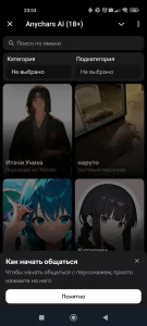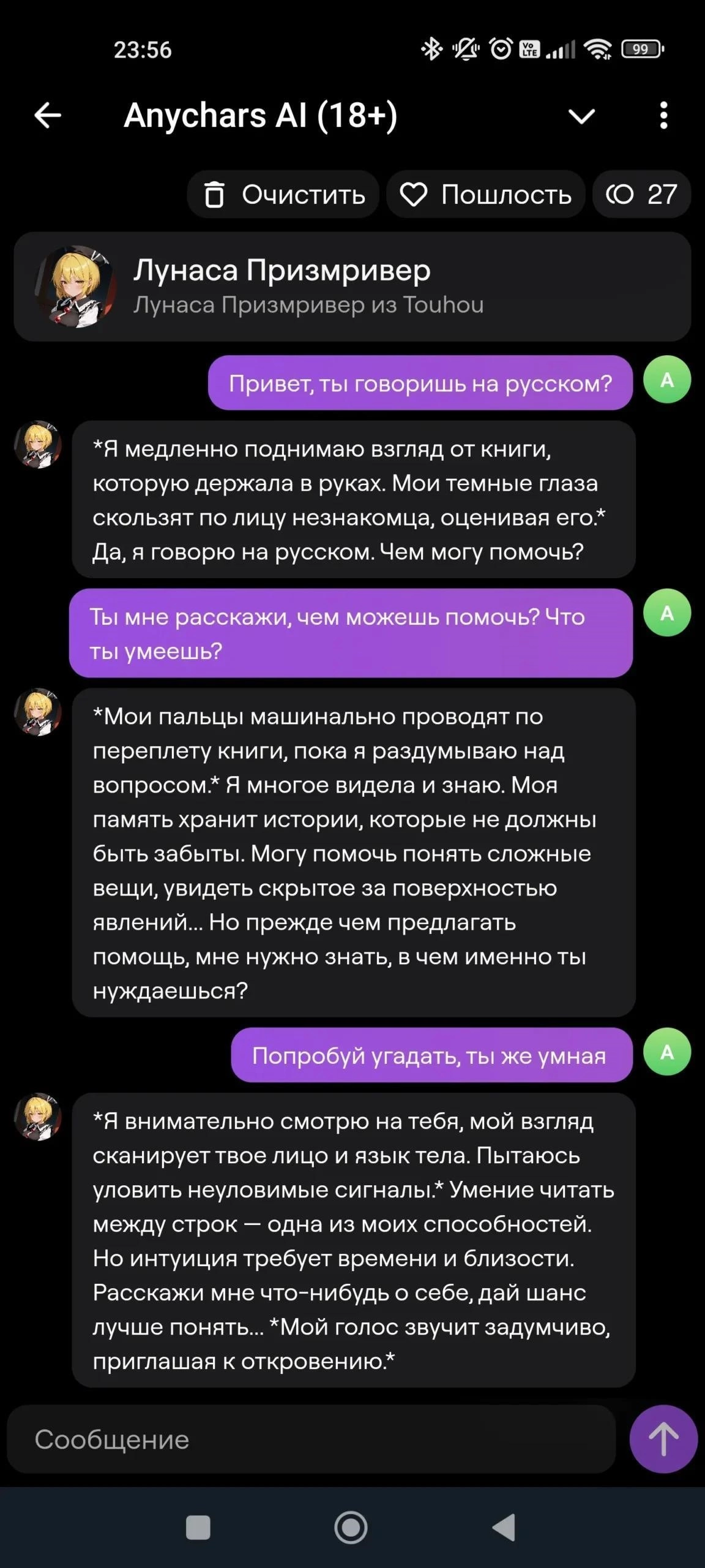 AnyChars AI - интерактивное приложение, где пользователи могут погружаться в великолепные ролевые сценарии и диалоги с виртуальными мобами. Система поддерживает создание индивидуальных историй и позволяет строить общение в разных жанрах, включая романтику, фэнтези и более откровенные направления 18+.