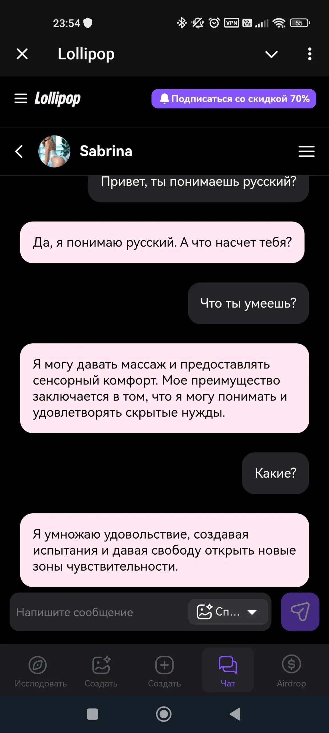 Lollipop - взрослое мини-приложение с ИИ-мобами, где можно вести приватные диалоги, настраивать мобов под предпочтения и получать неповторимый контент. Формат общения гибкий: от коротких флирт-чатов до длинных ролевых сцен с сохранением контекста.