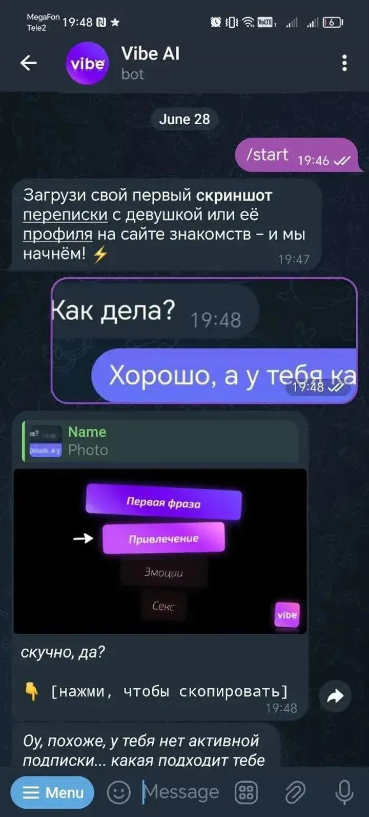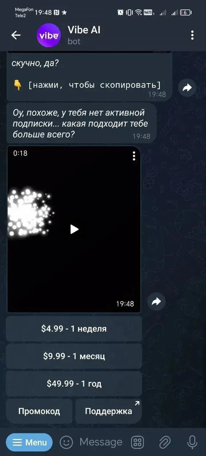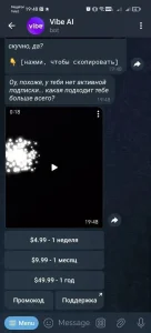 Рабочая ссылка на Vibe AI в Telegram. Количество активных юзеров у бота скрыто. Если приложение не работает или описание не соответствует действительности, напишите нам.