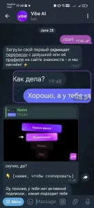 Vibe AI - мини-приложение для дейтинга, которое анализирует скриншоты переписок, профили и сторис и на их основе открывает персональные первые сообщения, варианты ответов в разных вайбах и подсказки, помогающие довести онлайн-общение до реальной встречи. Сервис позиционируется как dating copilot: он подсказывает, что сказать, как держать тон и как плавно переводить диалог к свиданию.