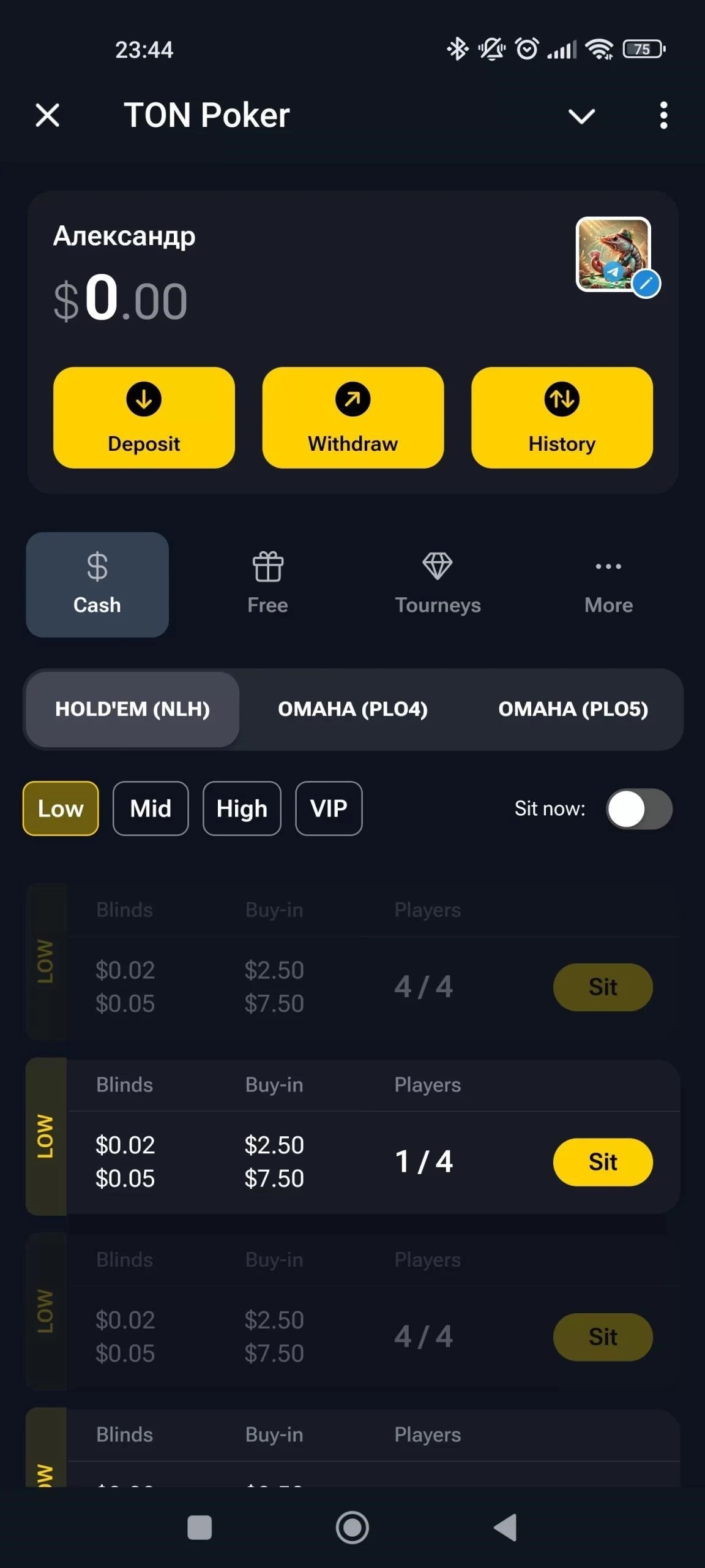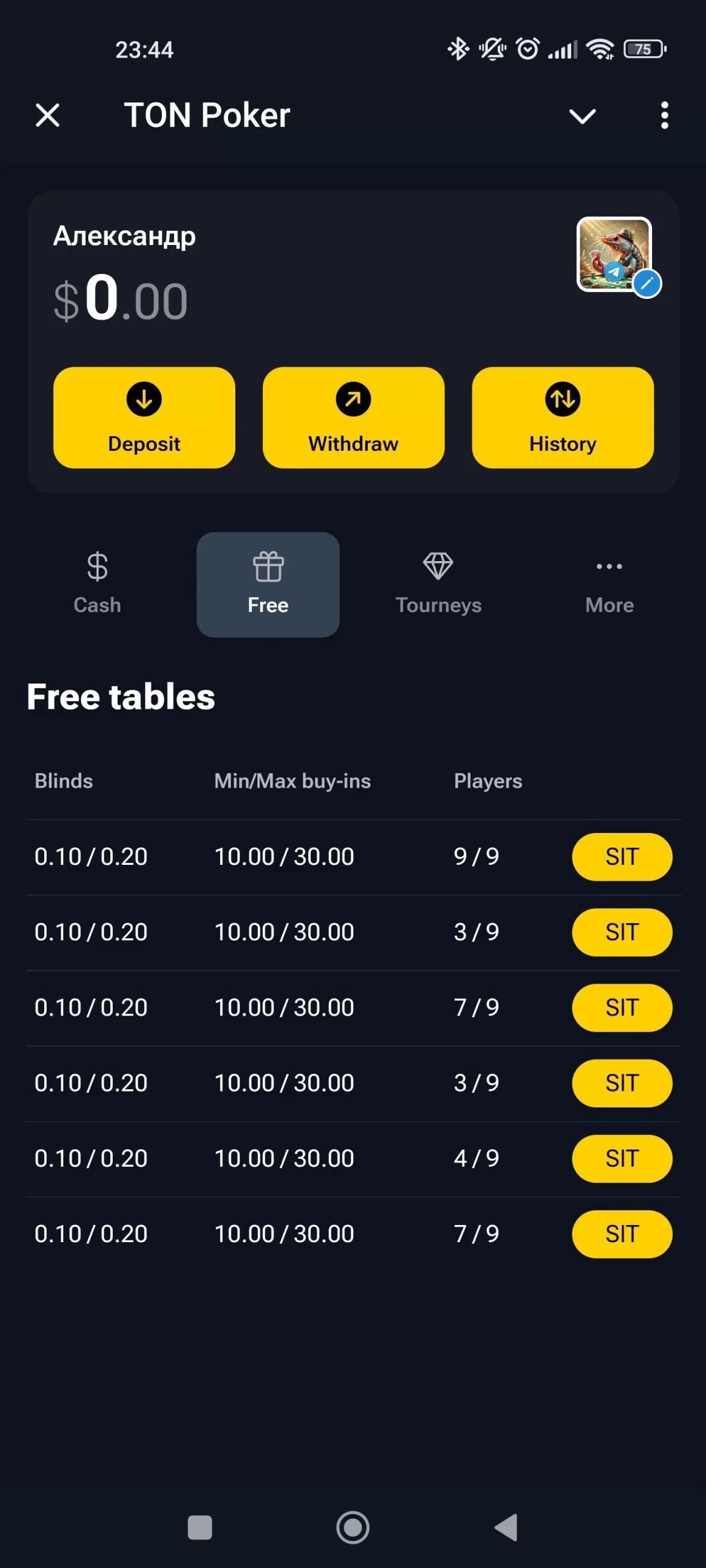 - Выберите лимит, валюту (демо или TON) и нажмите Играть - система подберёт стол или создаст приватный.