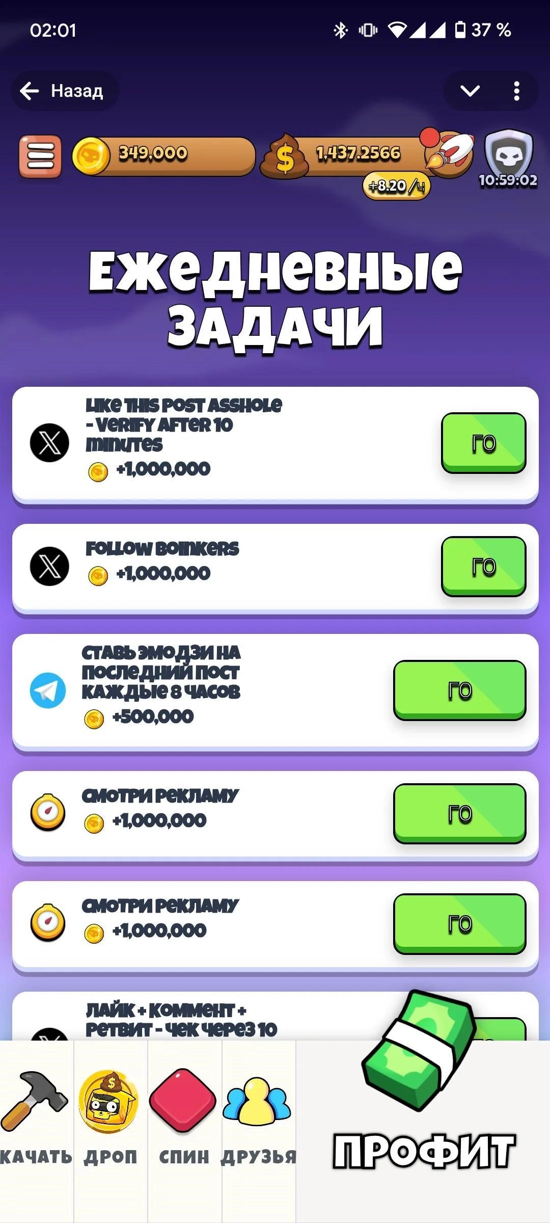 Boinkers - аркадная мини-игра с простыми кликами, короткими сессиями и системой внутриигровых монет. Механика строится на наборах очков, ежедневной активности и заданиях, за которые начисляются награды и бустеры.