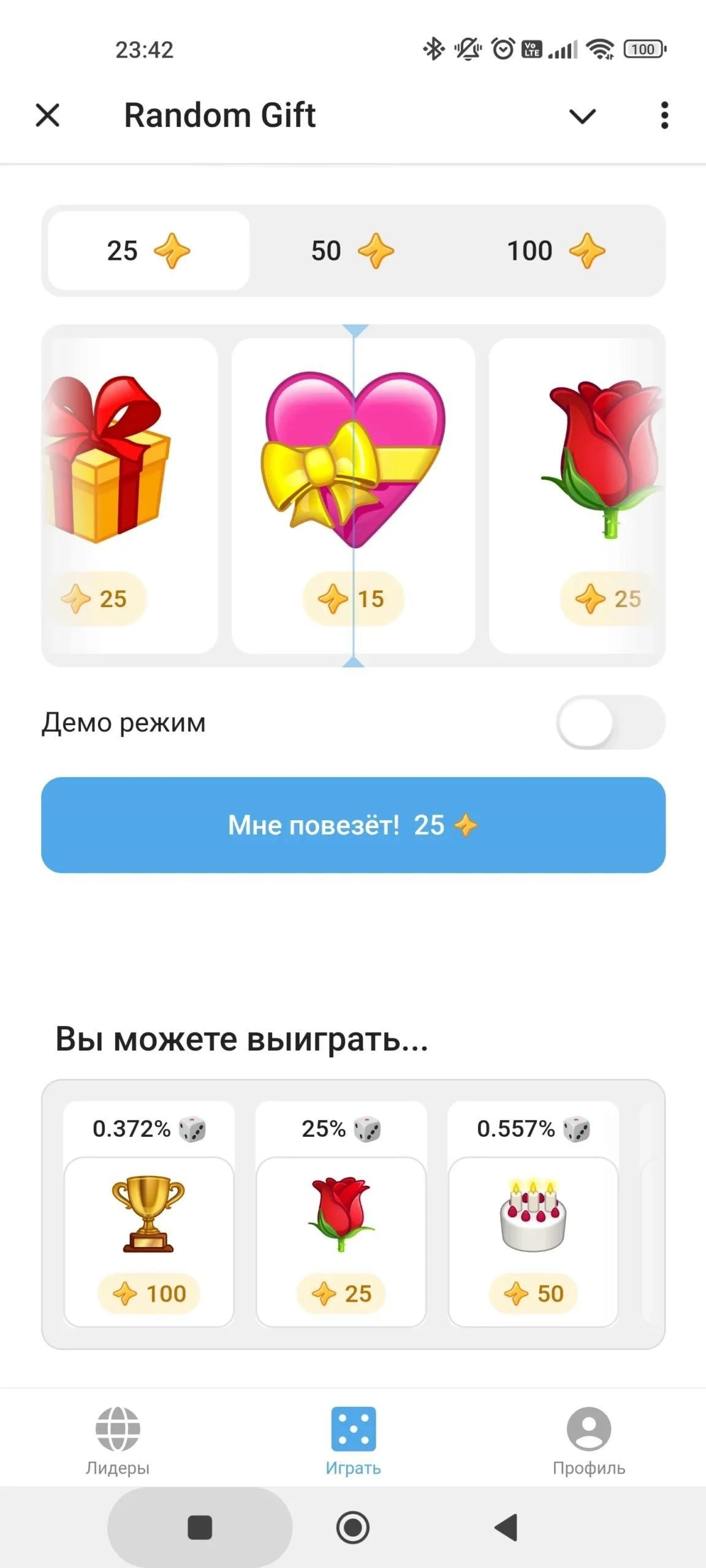 Бот работает по модели колеса удачи: каждый раунд - попытка открыть случайный лут по заданным шансам выпадения. Часть подарков активируется внутри экосистемы проекта, часть - передаётся на ваш аккаунт или кошелёк, если предусмотрена передача ценностей.