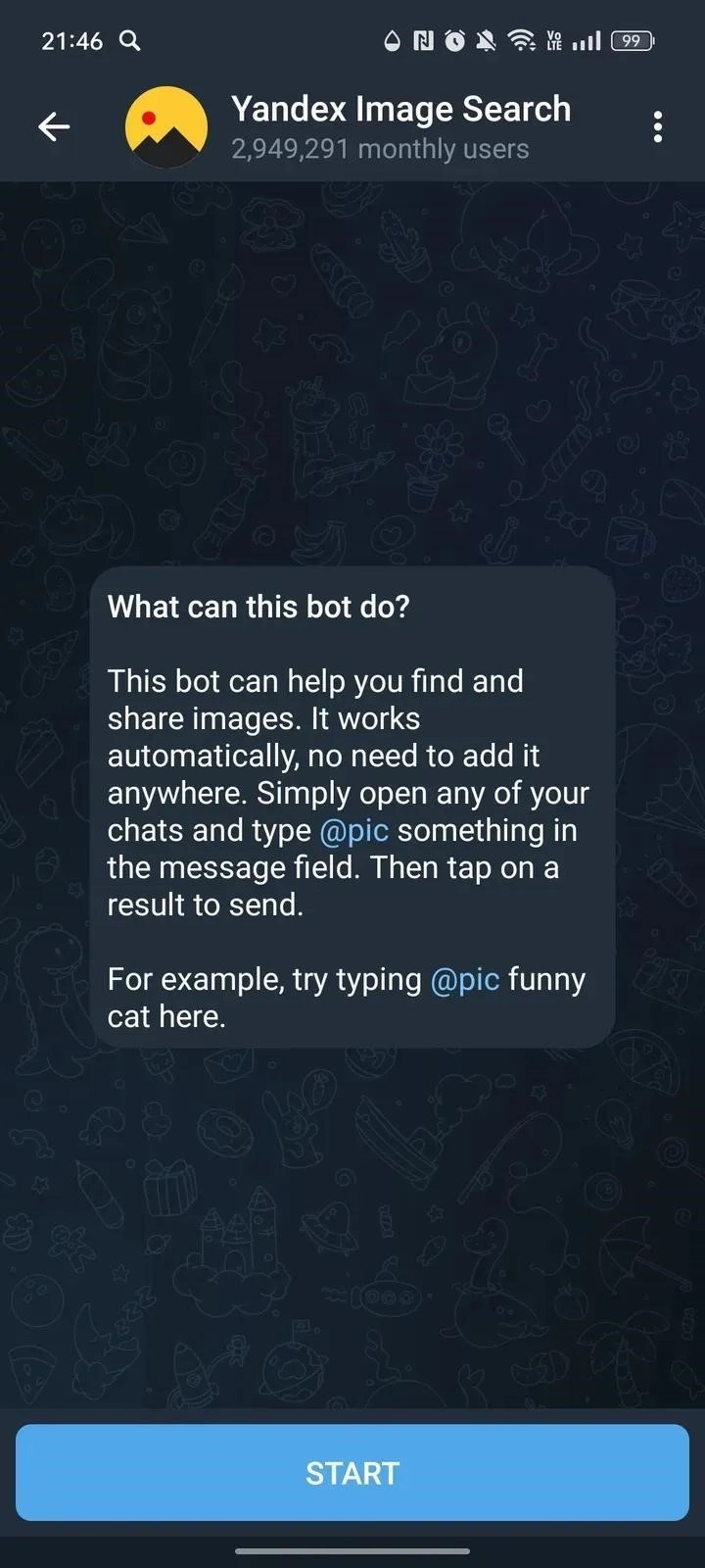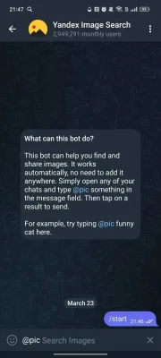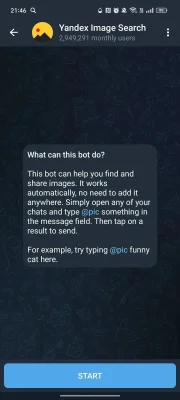 Рабочая ссылка на Yandex Image Search в Telegram. На данный момент у бота 3 872 142 активных пользователей в месяц. Если приложение не работает или описание не соответствует действительности, напишите нам.