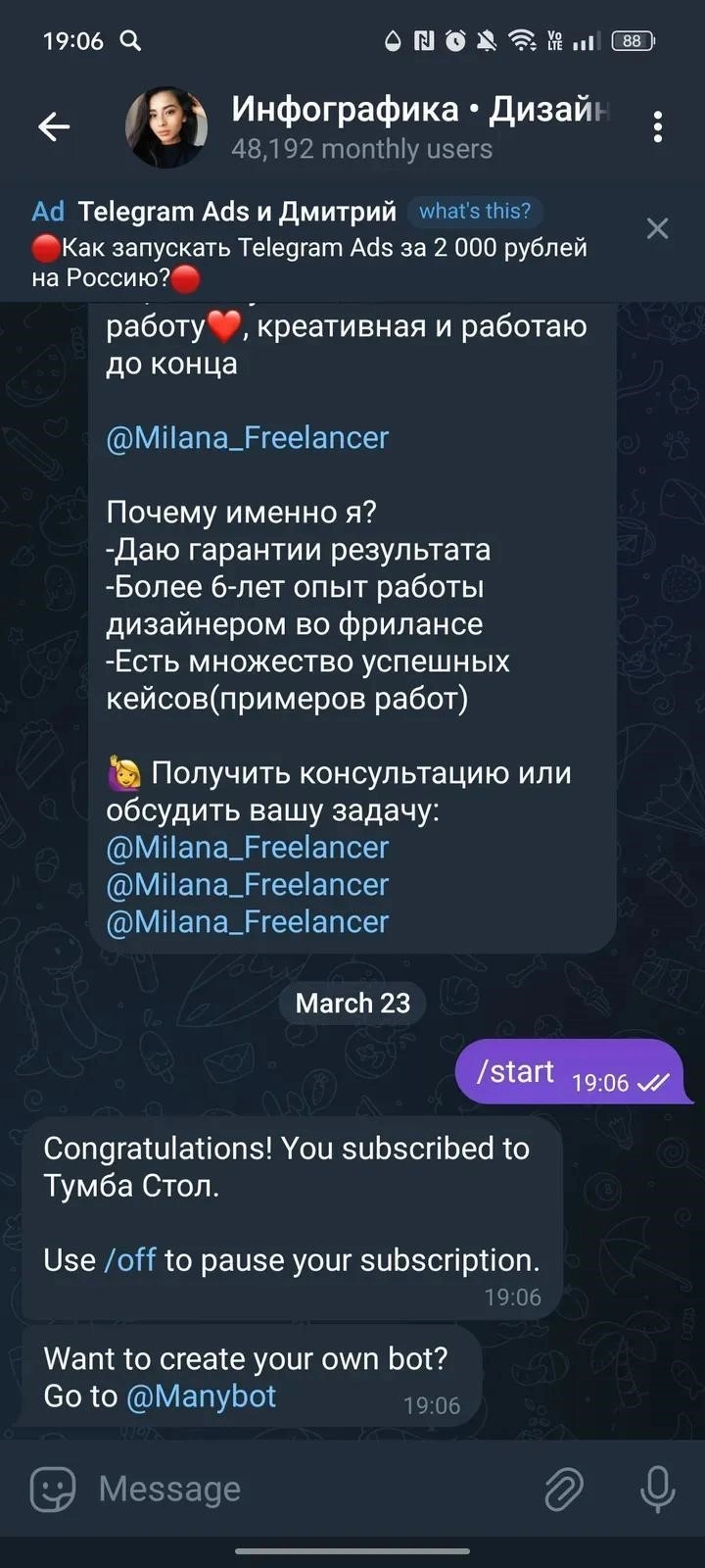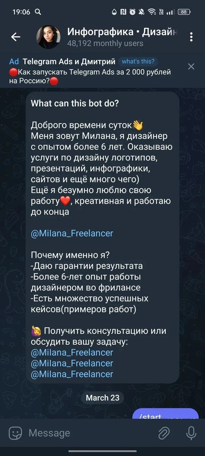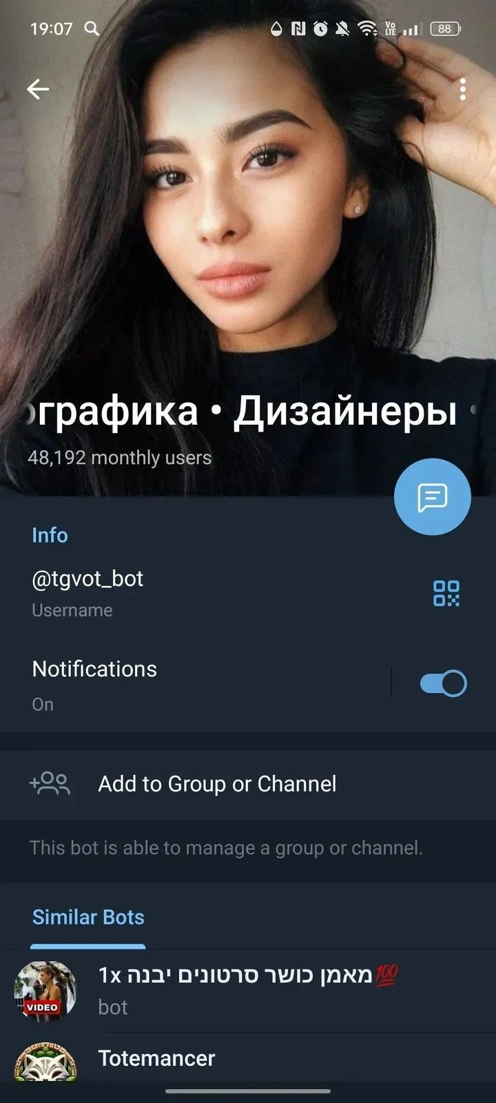 Рабочая ссылка на Инфографика • Дизайнеры • Карточки в Telegram. Количество активных юзеров у бота скрыто. Если приложение не работает или описание не соответствует действительности, напишите нам.