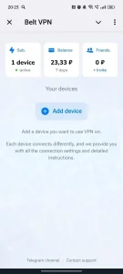 Belt VPN - мини-приложение для безопасного доступа к сети с управлением устройствами, соединениями и подпиской прямо внутри интерфейса бота.