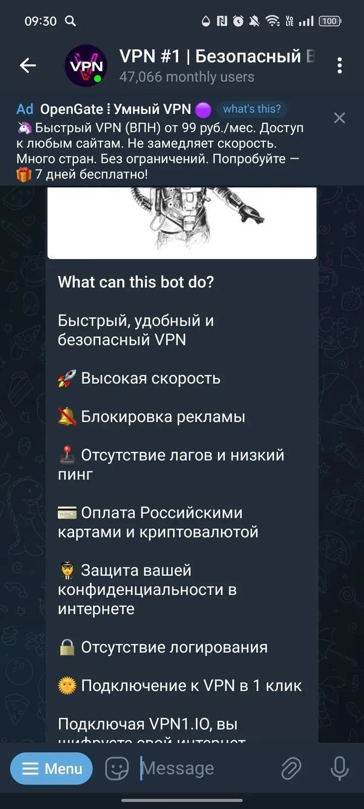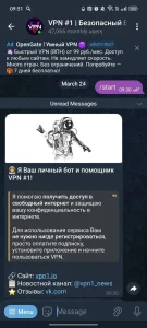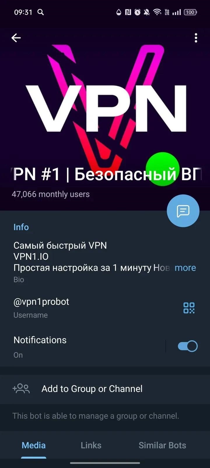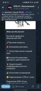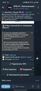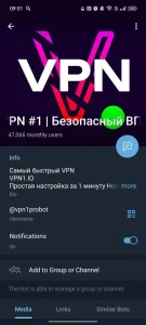 Рабочая ссылка на VPN #1 (@vpn1probot) в Telegram. На данный момент у бота 104 412 активных пользователей в месяц. Если приложение не работает или описание не соответствует действительности, напишите нам.