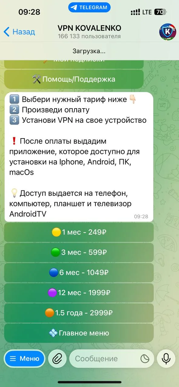Рабочая ссылка на VPN KOVALENKO в Telegram. На данный момент у бота 166 131 активных пользователей в месяц. Если приложение не работает или описание не соответствует действительности, напишите нам.